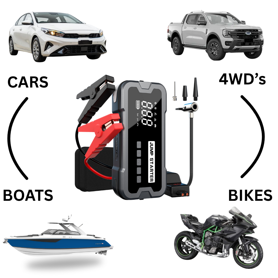 Perfect for cars, motorbikes, 4WDs, boats, and even sports gear. Its lightweight, compact design fits easily in your glove box or backpack — ready for any situation on or off the road.