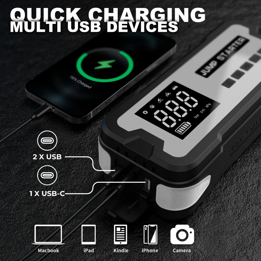 This isn’t just a jump starter — it’s a compact power hub. Use it as a portable air pump, flashlight, and power bank for phones, tablets, cameras, and camping gear. Designed to handle every task with ease.
