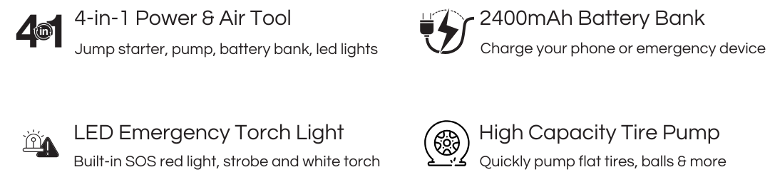 The AutoResQ 4 in 1 Portable Jump Starter with Air Pump Pro keeps you ready for anything on the road. This compact, high-powered unit delivers real peace of mind — combining a vehicle jump starter, air compressor, power bank, and LED safety light in one durable package. Perfect for road trips, camping, and daily commutes.