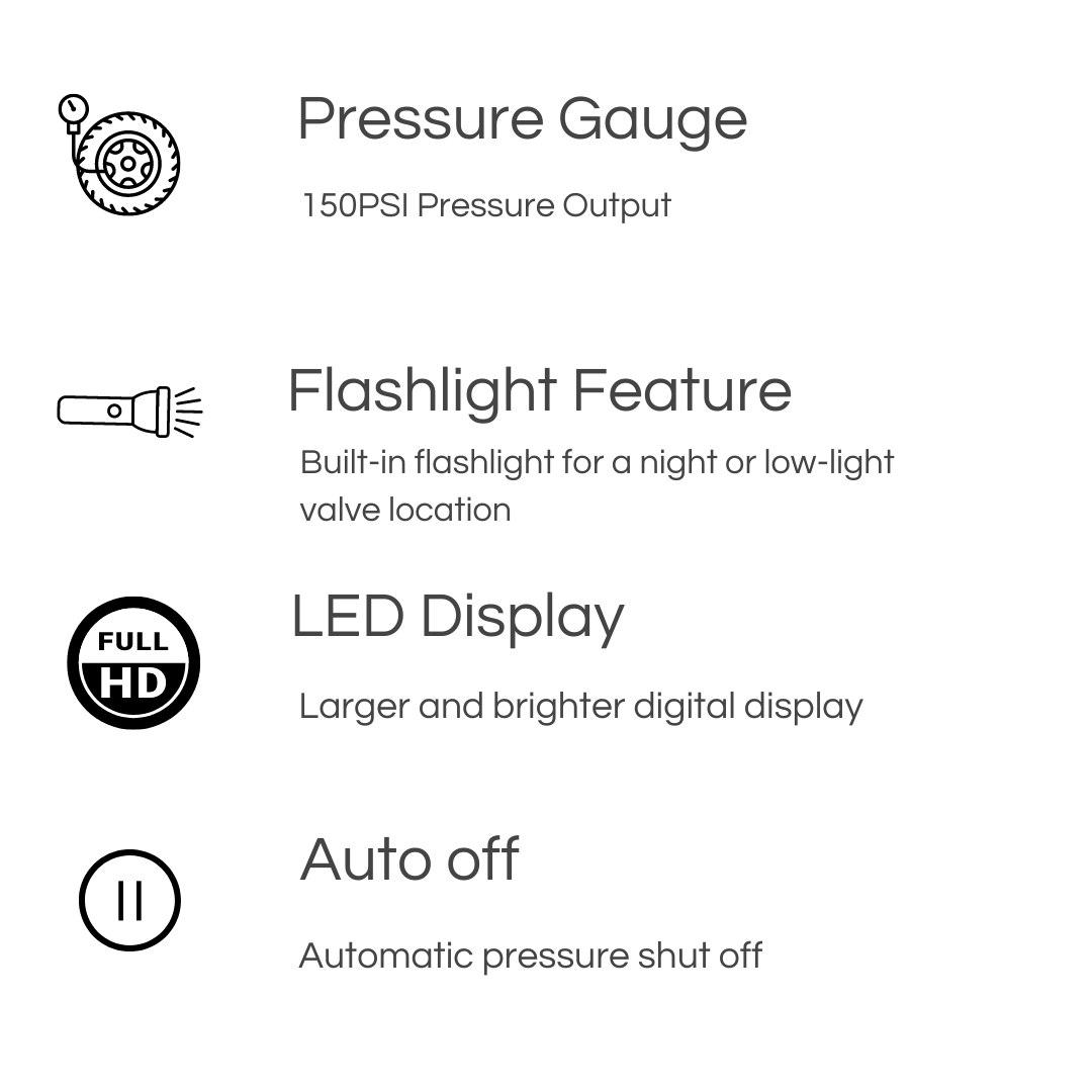 Say goodbye to flat tires and road emergencies –  PowerFlow Electric Smart Pump  is here to keep you rolling with confidence. Not just a portable air pump, our car air pump shines with additional features. The LED light on top transforms it into an emergency power source in the dark.